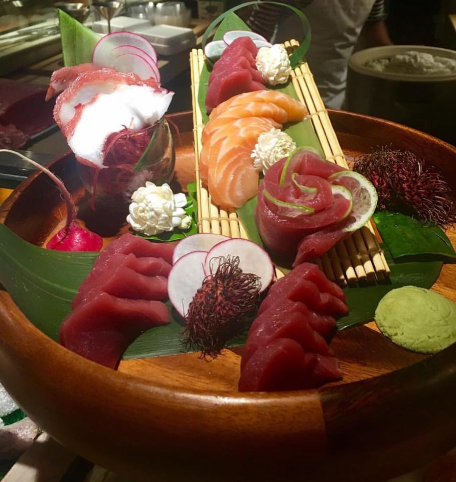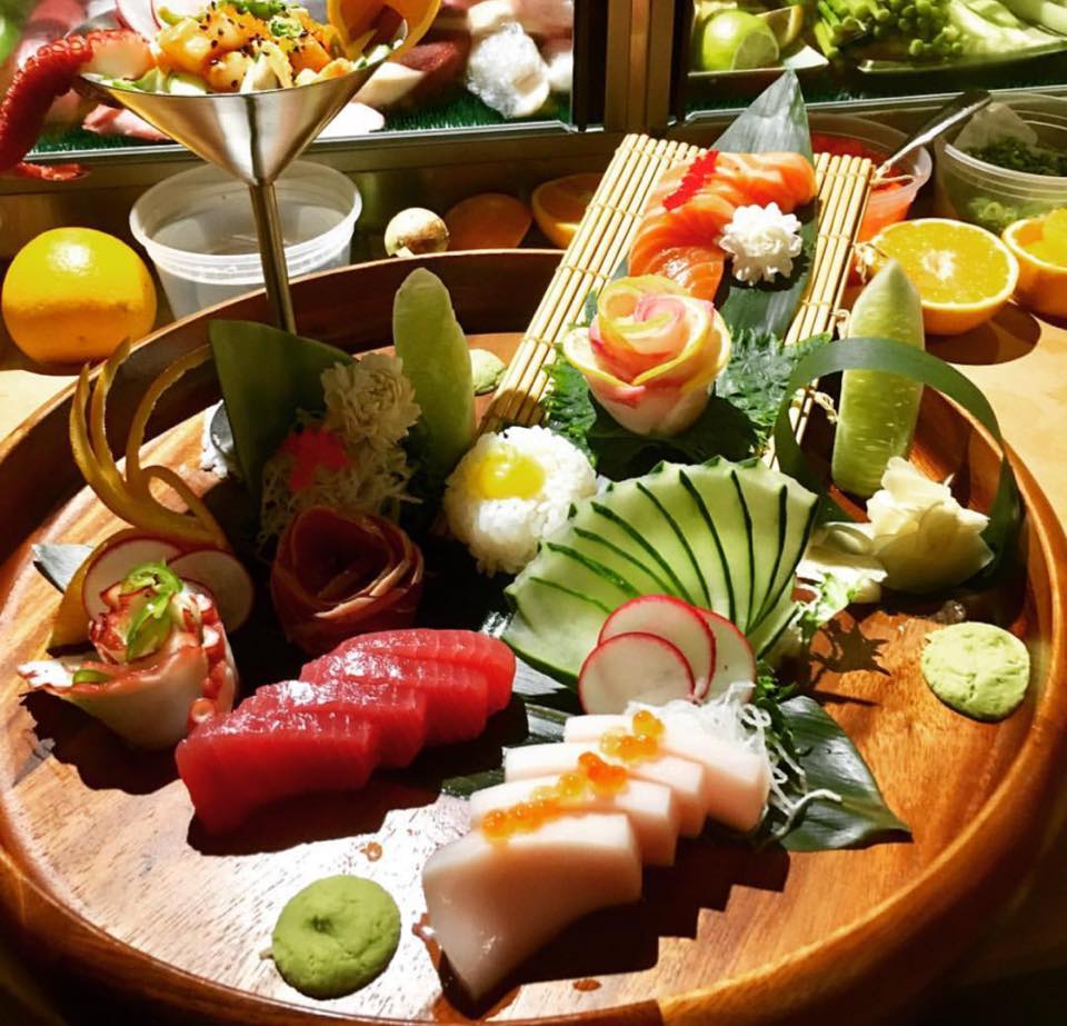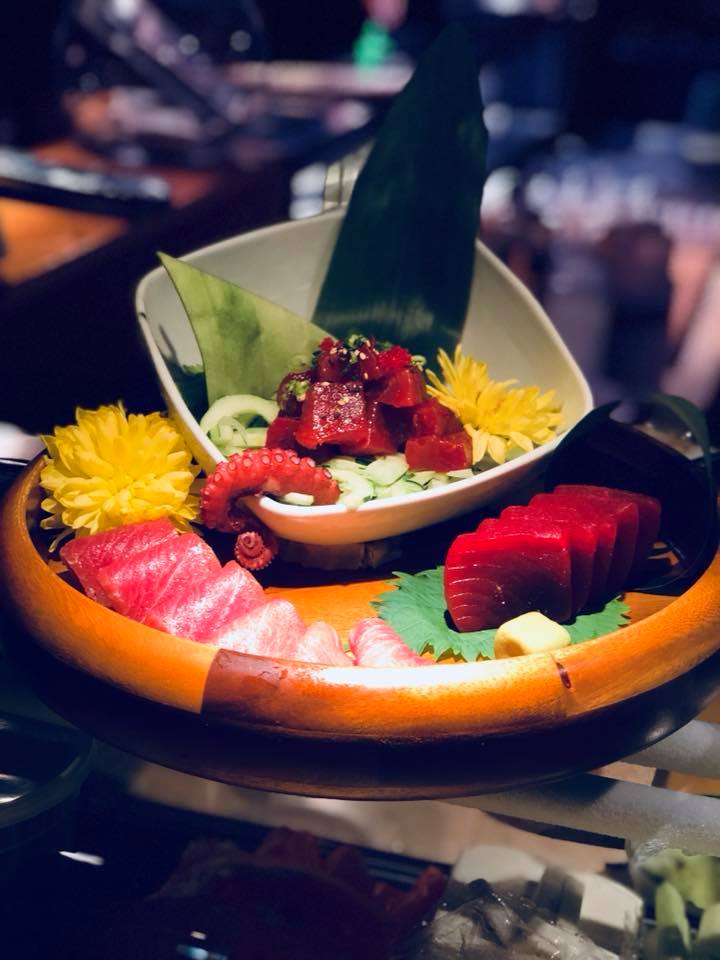 JB roll, spicy tuna roll, rainbow roll, shrimp tempura roll, 12 pieces sashimi, 10 pieces sushi.