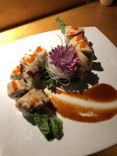 Shrimp tempura, asparagus, avocado, scallions, topped with fried catch of the day with special sauce.
