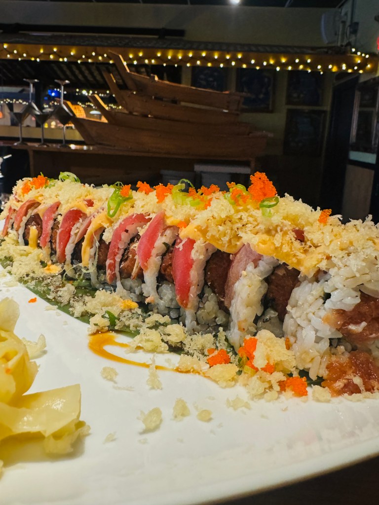 Spicy tuna, avocado, scallions, and asparagus topped with seared tuna, eel sauce, tempura flakes, and masago.